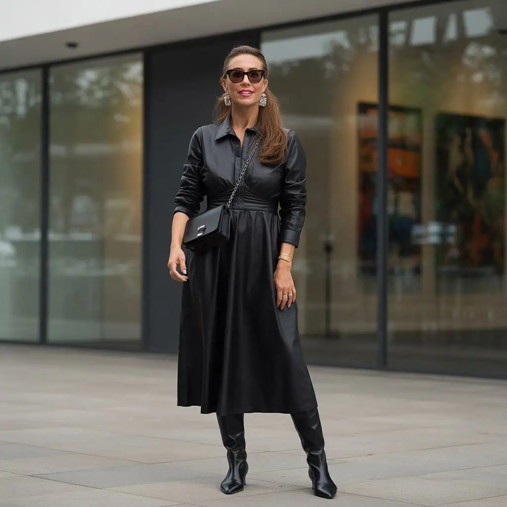 The matte black midi dress is a wardrobe essential that effortlessly combines style and sophistication, making it a perfect choice for women over 50. Its gently cinched waist flatters the figure, providing a balanced silhouette while allowing freedom of movement. The matte texture keeps the look chic yet understated, ideal for day-to-night transitions. Paired with knee-high leather boots, this ensemble elevates the outfit, offering both comfort and style. Accessories like oversized black sunglasses and statement earrings add a touch of glamour without overwhelming the simplicity of the dress, striking the perfect balance between timeless elegance and modern flair.