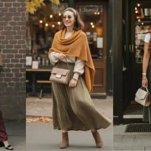 Cashmere sweaters are synonymous with luxury and comfort, making them an essential staple this autumn. A soft camel shade drapes beautifully, enhancing the wearer’s natural warmth and lending a chic, relaxed vibe. Pairing this cashmere delight with wide-leg cream trousers strikes a harmonious balance, emphasizing a figure-flattering silhouette. The taupe kitten heels add just the right amount of height while ensuring comfort for daily wear. A crossbody cognac bag introduces a touch of earthy elegance, complemented by oversized square sunglasses that elevate the overall look. This ensemble speaks of effortless style, perfect for cozy outings or casual lunches.