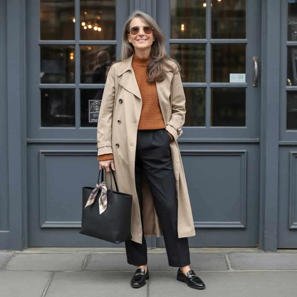 There’s something timeless and empowering about a classic trench coat, especially as the leaves begin to change. When draped over a burnt-orange knit top, the beige trench provides a chic contrast that’s both warm and inviting. Black trousers create a streamlined silhouette, allowing the coat to take center stage. The loafers add a touch of sophistication while being practical for daily wear. Accessorizing with a black tote and aviator sunglasses enhances the look, making it effortlessly stylish. A silk scarf tied to the bag handle is a subtle yet eye-catching detail that adds personality. This outfit embodies confidence and modern elegance, making it a staple for autumn.