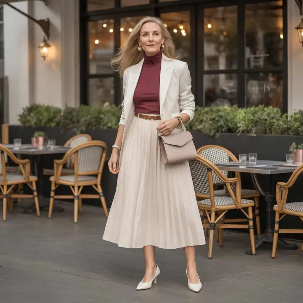 Midi skirts are a classic choice for women in their 60s, effortlessly blending style and comfort. The flowing cream fabric drapes gracefully, offering a sense of elegance while remaining versatile for various occasions. By tucking in a rich burgundy turtleneck, you create a striking contrast that draws attention to the waist—a flattering look for all figures. Layering a cream blazer adds structure, balancing the softness of the skirt. A slim brown belt ties the outfit together, grounding the look while the kitten heels lend height without sacrificing comfort. This ensemble is perfect for autumn outings, where warmth and style coexist beautifully.