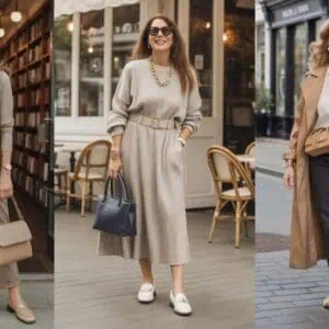 For those who love the comfort of dresses during colder months, a knit dress is a perfect choice. The charcoal knit dress with its wide belt accentuates the waist while offering warmth and texture. Comfortable black loafers create a sleek base, allowing the dress to be the standout feature. Such a combination not only provides elegance but also function, making everyday outings feel special without the need for excessive layering. Minimalist jewelry and a matching handbag ensure the look stays refined—not overdone—while sunglasses add a chic edge. This outfit proves that simplicity can be striking, especially in the cooler seasons.