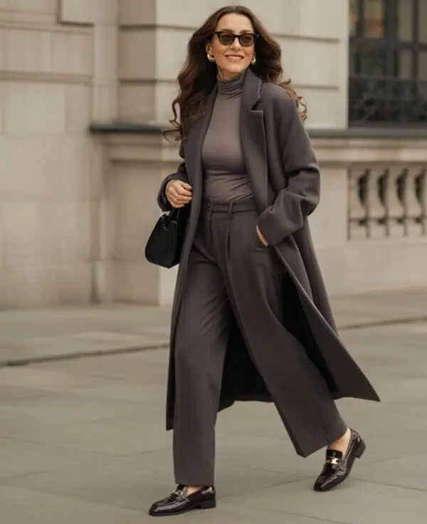 Charcoal and soft gray is a sophisticated pairing that creates a serene, understated look suitable for any occasion. The soft gray turtleneck serves as a cozy yet sleek foundation, especially when neatly tucked into charcoal tailored trousers, which lend structure and shape. This monochromatic scheme exudes an effortless chicness, ideal for women over 50 looking to maintain elegance without sacrificing comfort. Round black sunglasses introduce a stylish edge while providing sun protection, and a quilted black shoulder bag adds texture and functionality. Elegant silver stud earrings catch the light beautifully, framing your face in a flattering manner. With chic gray mules completing the outfit, you’ll achieve both luxury and ease with every step you take.