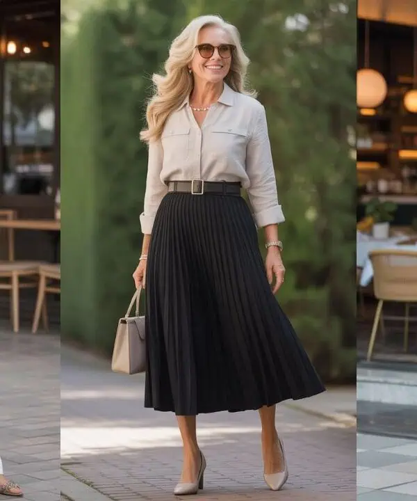 Burgundy’s richness adds sophistication, while cream provides a light, face-brightening contrast. Women over 50 benefit from this pairing because it combines depth with luminosity. Try a cream turtleneck with a burgundy skirt, or a burgundy coat over cream trousers. The cream softens burgundy’s intensity, making it wearable for both work and casual occasions. Accessories in gold or rose gold enhance the warmth of this palette beautifully.