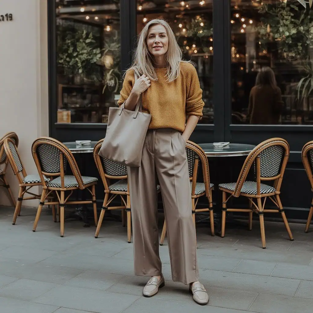 A soft knit top paired with wide-leg trousers strikes the perfect balance between comfort and style, making it an ideal choice for those over 50. The loose fit of the trousers allows for ease of movement while still presenting a polished silhouette. Opting for a vibrant mustard knit top brings warmth to the outfit, highlighting your complexion and adding a pop of color. Pairing this ensemble with loafers gives you that effortless chic vibe, while a medium tote and a scarf lend an air of sophistication. This look makes a statement without feeling too formal—perfect for transitioning from day to evening outings.