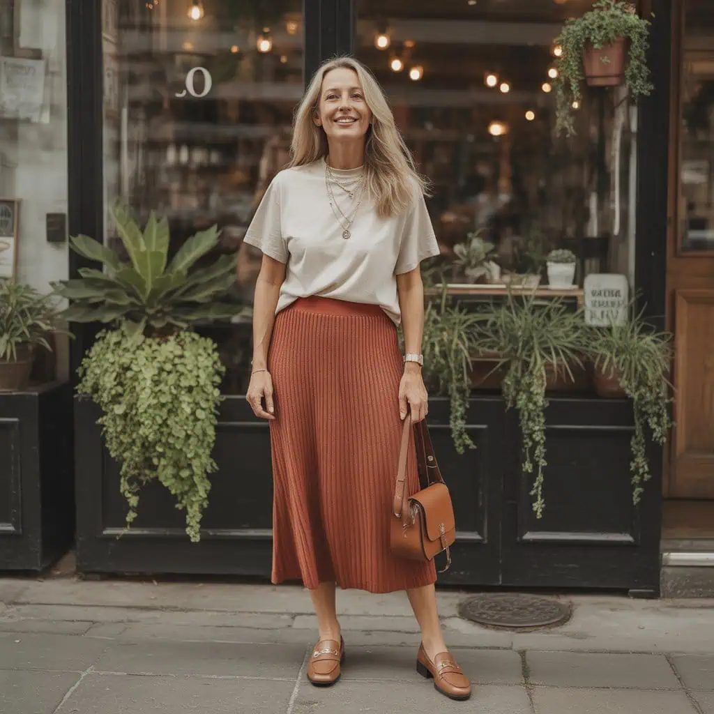 Effortless style shines through when a tucked-in tee is paired with a vibrant knit skirt. The cream color of the tee acts as a neutral base that allows the burnt orange of the skirt to take center stage, providing an eye-catching pop of color that radiates warmth and vitality. The act of tucking the tee enhances your silhouette, creating a pleasing proportion where the skirt flows gracefully from the waist down. Accessorizing with layered necklaces introduces a playful touch, while a crossbody bag keeps everything relaxed yet fashionable. This combination embodies a carefree spirit, proving you can be both comfortable and chic at any age.
