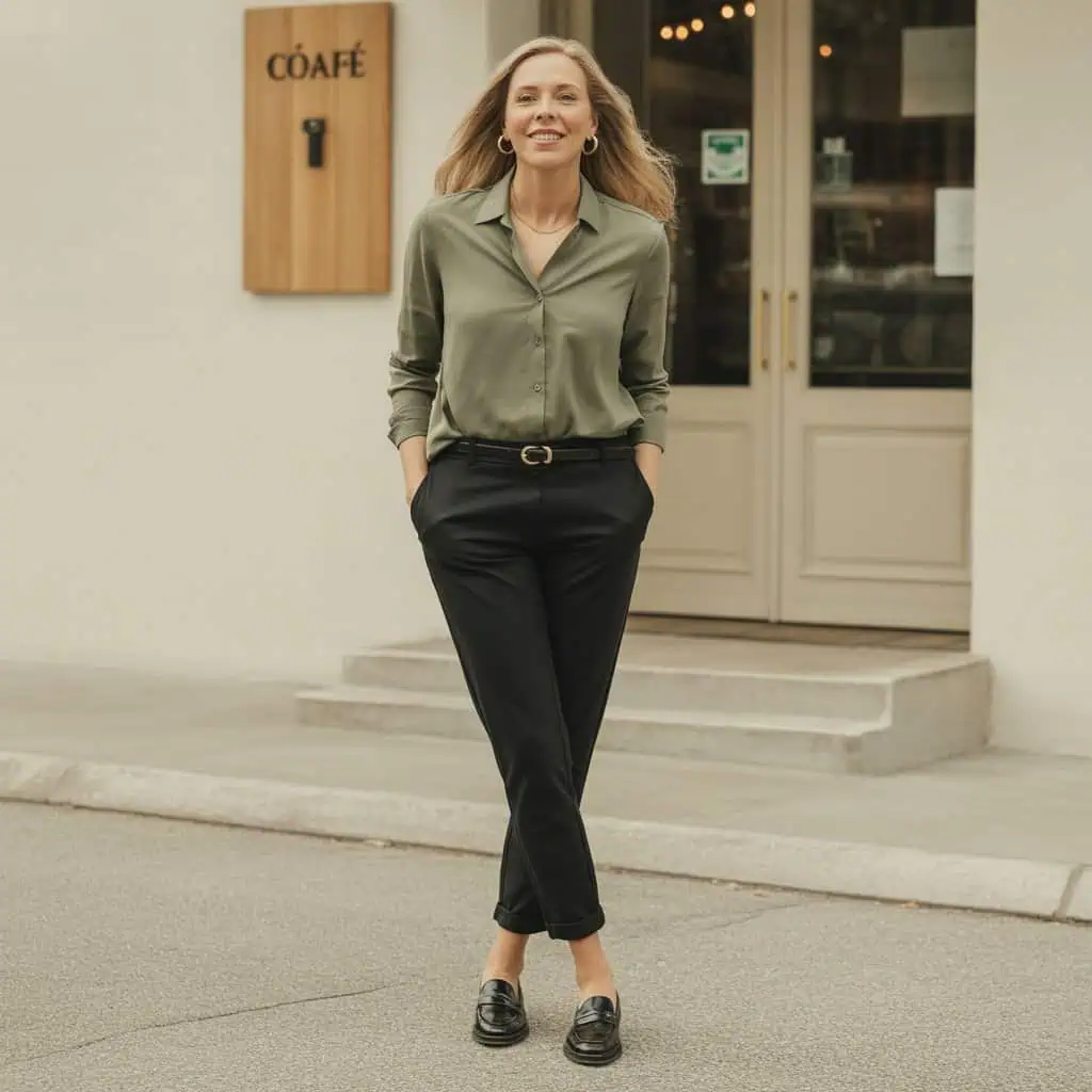 This chic ensemble marries classic elegance with comfort, making it perfect for effortless style at any age. A button-down shirt, particularly in a rich olive tone, brings a polished touch that easily elevates a casual look. Tucking it into stretch ponte pants emphasizes your waist while providing ease of movement, ensuring you stay comfortable throughout the day. The slim belt adds just the right amount of definition, while hoop earrings introduce a modern flair that’s both timeless and trendy. Opting for loafers not only adds a dash of sophistication but also keeps your feet happy for whatever the day holds.