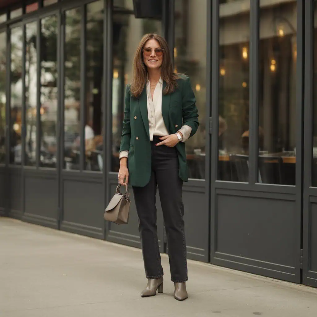 Elevate your everyday attire with a tailored blazer thrown over dark straight-leg jeans. This combination seamlessly walks the line between polished and relaxed, making it versatile for various occasions. A forest green blazer adds richness and depth, while keeping the outfit fresh and modern. Layering it over a cream blouse provides a classic contrast that shines without trying too hard. The straight-leg jeans offer a flattering fit for all body types, and when paired with heeled boots, they elongate the leg line. A structured handbag and chic sunglasses encapsulate effortless sophistication, making this ensemble a wardrobe essential.