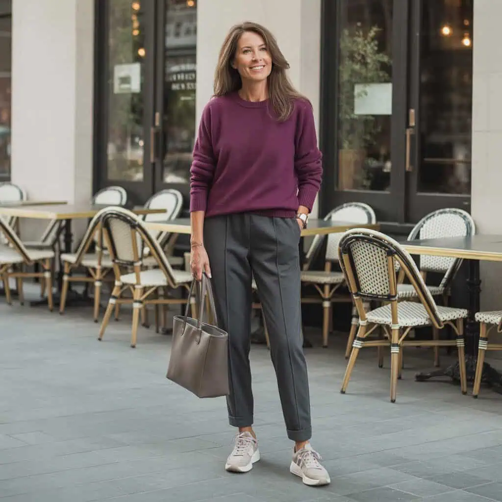 A cozy cashmere sweater is a luxury you deserve, and when paired with tailored joggers, it strikes the perfect balance between relaxation and refinement. The plum hue brings warmth and richness, which is universally flattering and ideal for layering during changing seasons. Choosing joggers with tailored details turns what could be a purely leisurely outfit into something polished enough for brunch or an afternoon outing. Subtle studs offer a refined sparkle, while a medium tote seamlessly combines style and practicality, allowing you to embrace the day with confidence. This outfit proves comfort doesn’t have to mean compromising on style.