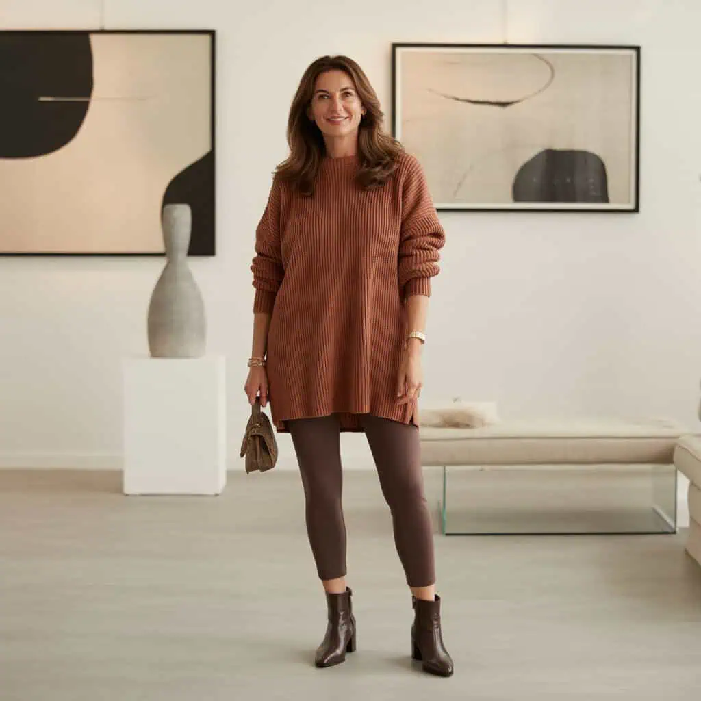 A tunic sweater paired with leggings is the ultimate cozy-chic combination that’s effortlessly stylish. This ensemble works beautifully after fifty because it elongates the silhouette and provides ample coverage without feeling frumpy. Choose a rich color like burnt sienna to add warmth and vibrancy, while chocolate brown leggings offer a solid base that enhances the tunic’s flow. Ankle boots elevate the outfit further, granting a touch of sophistication without compromising comfort. Accessorizing with a small handbag creates an air of effortless elegance, making this look perfect for a gallery visit or a casual lunch date, all while keeping you feeling fabulous.
