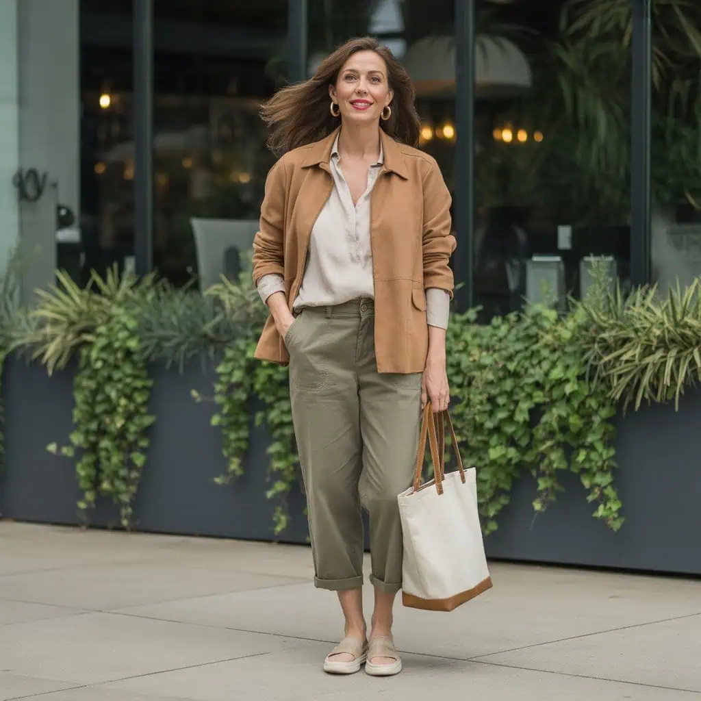 Pairing a structured jacket with relaxed chinos brings together sophistication and comfort, striking a perfect balance for stylish women over fifty. The structured element of the jacket elevates the look, adding polish without sacrificing ease. Opting for a neutral shade, like camel, allows versatile styling with various tops. The relaxed chinos offer a laidback vibe, providing breathable wear while still looking put-together. Complement the ensemble with slip-on shoes for a seamless transition from day to night. Finishing touches, such as hoop earrings and a chic tote, infuse personality and ensure you’re ready for anything while radiating confidence.