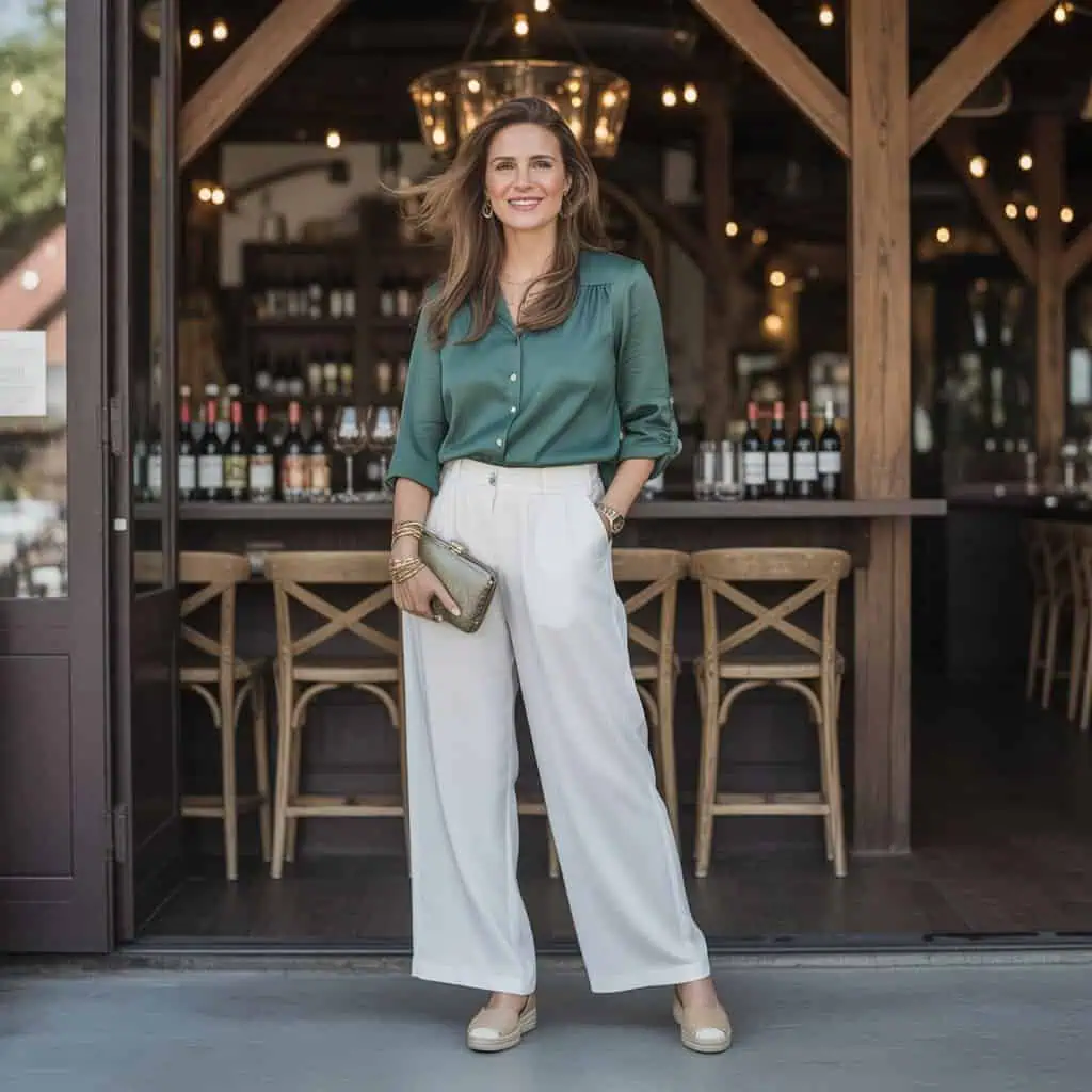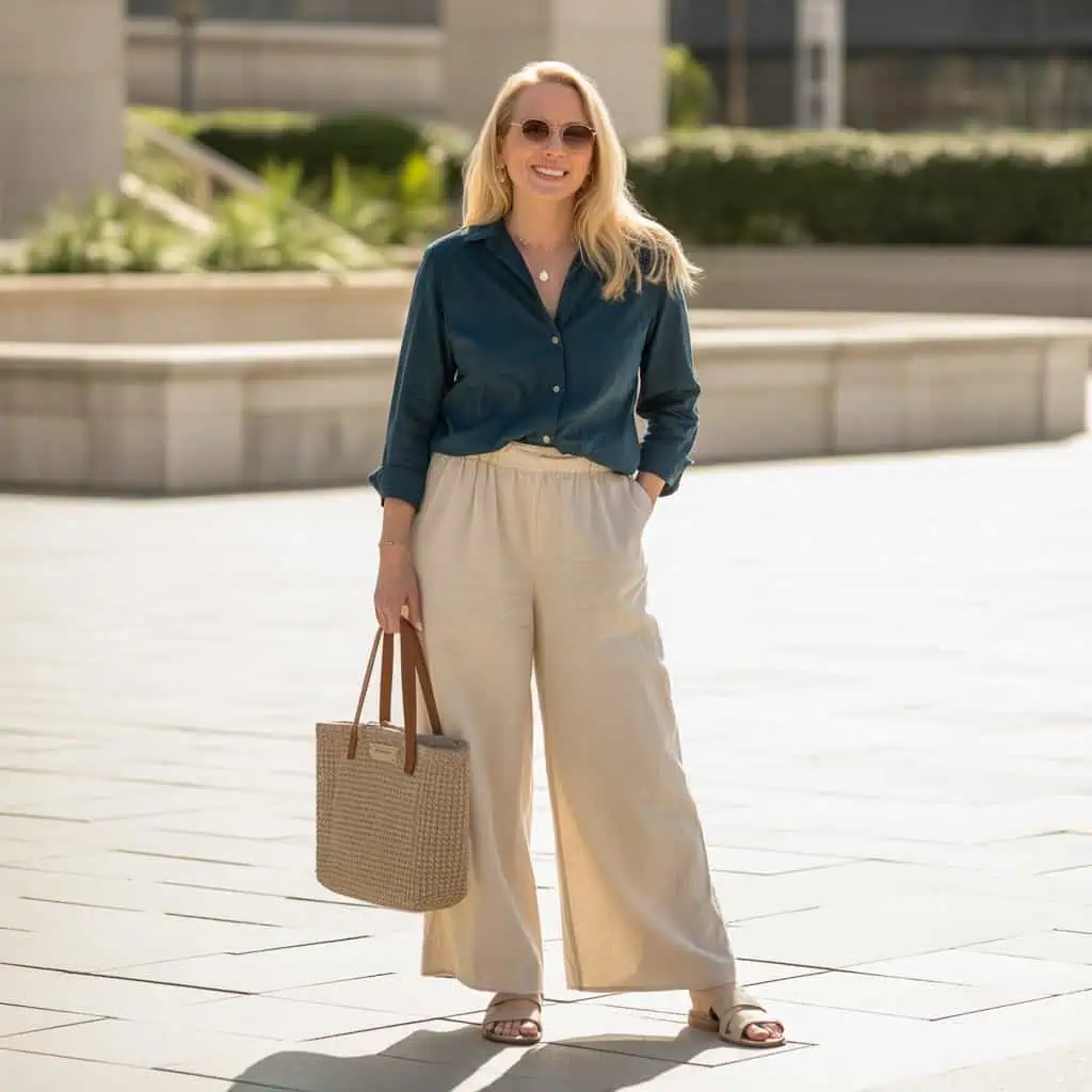 A crisp button-up shirt tucked into wide-legged linen pants is a classic ensemble that epitomizes timeless elegance. This outfit is stylish yet breathable, making it ideal for any woman seeking comfort and chicness after 50. A deep teal button-up injects a burst of color, providing a fresh twist to nighttime outings or daytime occasions. The ivory linen pants introduce a lightness, flowing beautifully with movement and ensuring all-day comfort. A structured tote and sunglasses complete the look, adding practicality and flair. This outfit celebrates maturity with a sophisticated edge, perfect for sunny strolls or casual gatherings with friends.