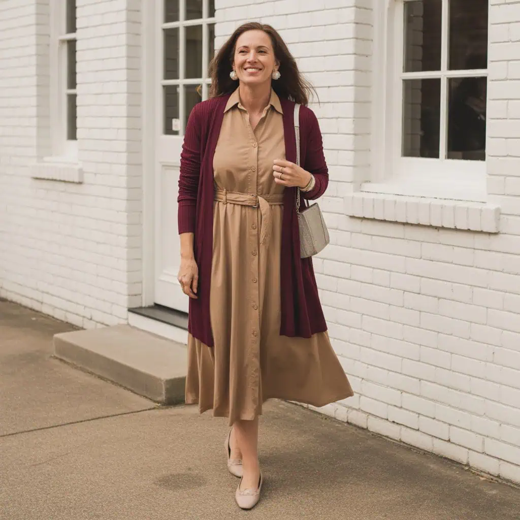 A lightweight cardigan layered over a midi dress creates a chic, effortless look that’s perfect for transitional seasons. The cardigan adds warmth without overwhelming the outfit, making it a vital piece for those cool afternoons. In deep burgundy, it introduces a touch of elegance while the camel midi dress offers a neutral base that’s both timeless and easy to accessorize. Ballet flats keep the vibe casual yet polished, and pearl earrings add a classic finish that elevates the whole look. This outfit embodies comfort and style, ensuring you feel both relaxed and fashionable whether you’re heading to lunch or running errands.