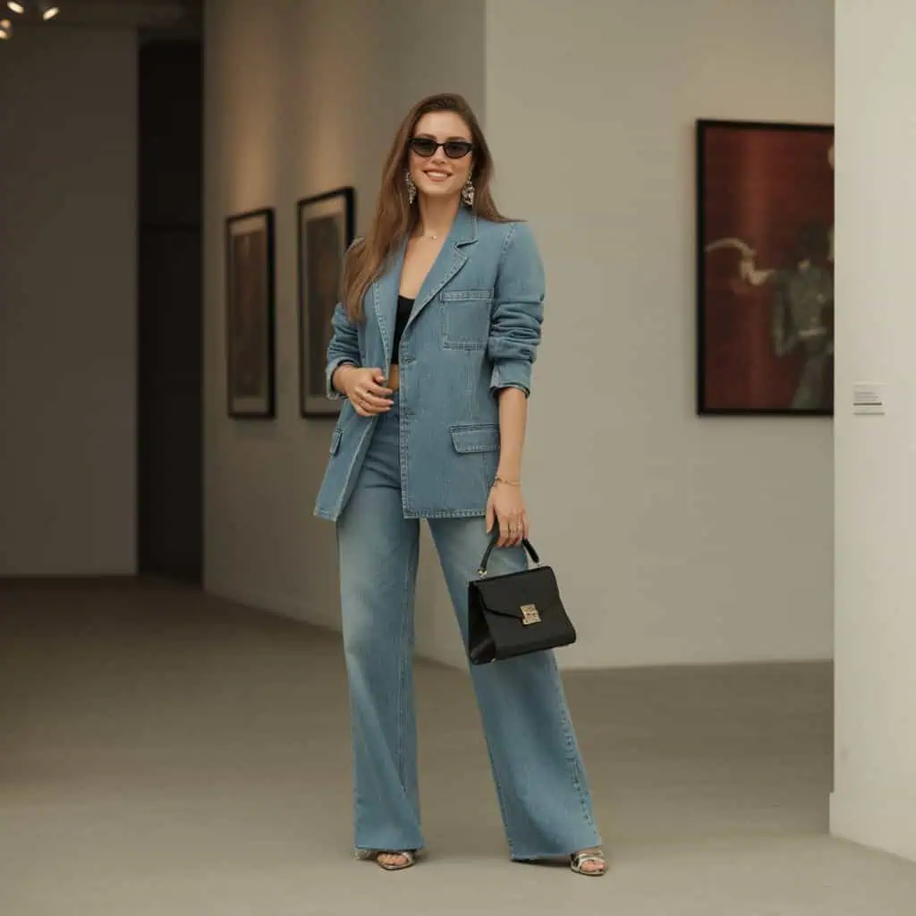 This look strikes the perfect balance between polished and casual chic. A tailored denim blazer elevates the denim on denim trend by introducing a structured silhouette that plays well with the relaxed fit of wide-leg jeans. The heels add a touch of sophistication and elongate the legs, ensuring you look effortlessly stylish. Statement earrings and cat-eye sunglasses inject elements of fun, while the structured handbag keeps the ensemble grounded. It’s a versatile outfit that’s perfect for a day at the office or a stylish evening out, proving that denim can be dressed up beautifully.