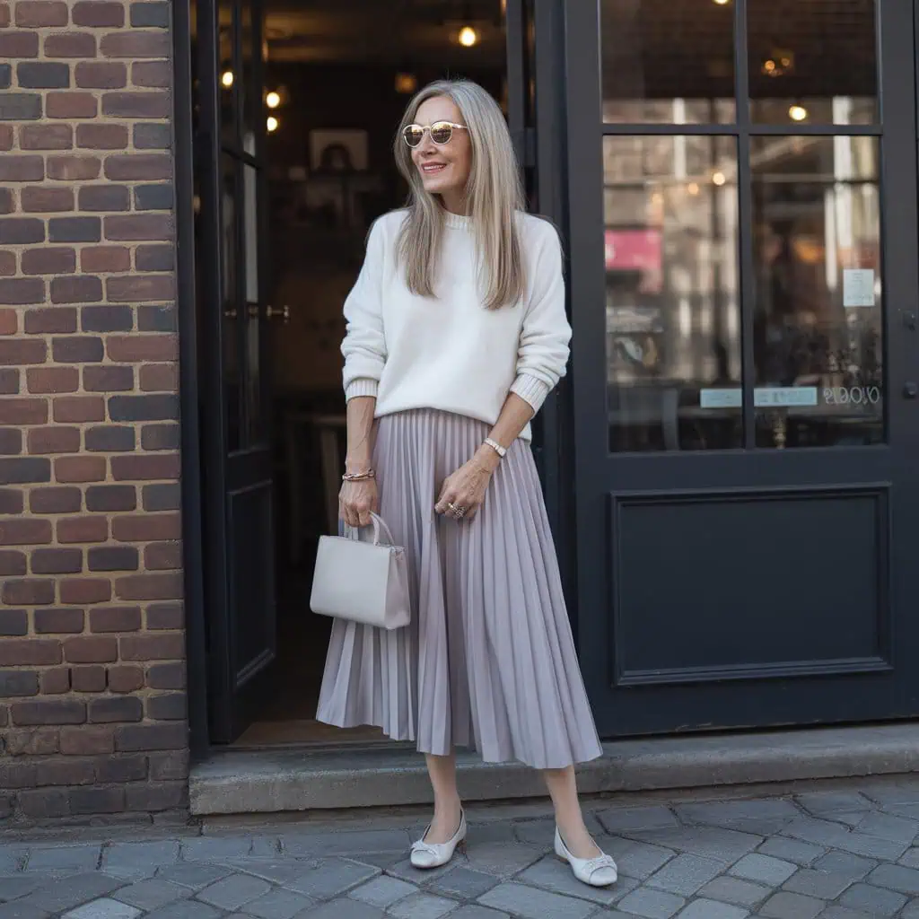 Infusing your wardrobe with a cashmere sweater and midi skirt combines warmth and style effortlessly. Cashmere provides a luxurious, soft feel that’s ideal for evenings out, while the flowy texture of a midi skirt can create an ethereal vibe, swaying softly with each step. This pairing allows for a casual yet chic appearance, making it suitable for a relaxed dinner or a semi-formal gathering. Ballet flats keep the outfit grounded, while stylish sunglasses add a contemporary flair. Eye-catching jewelry can introduce a bit of personality, ensuring that you stand out gracefully while still embracing comfort and style—perfect for the dynamic lifestyle of someone in their 60s.