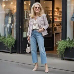 Silk shirts paired with tailored trousers radiate sophistication and understated elegance. An ivory silk shirt tucked into soft gray trousers presents a refined aesthetic that is effortlessly chic. Silk drapes beautifully, providing a hint of luxury that’s perfect for dressing up or down depending on the occasion. The addition of a slim beige belt works wonders in defining the waist, adding polish to the overall look. Light loafers keep it comfortable while still being stylish. To elevate the outfit, accessorizing with pearl jewelry and a taupe handbag adds a sophisticated touch that captures the essence of timeless style.