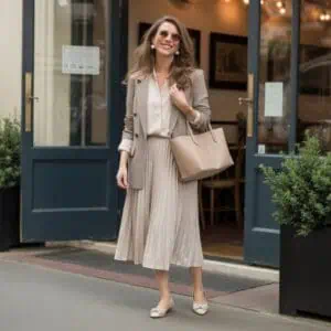 Too many soft or drapey pieces can make an outfit look shapeless. Stylists anchor these elements with at least one structured item: a tailored blazer, crisp trousers, a defined coat, or a sculptural handbag. Structure creates clean edges and strong lines, correcting proportion by giving the eye something stable to focus on. Pairing soft knits with tailored pants or floaty dresses with structured jackets adds sophistication and visual clarity. This habit prevents outfits from collapsing into softness and ensures you maintain a balanced, modern shape.