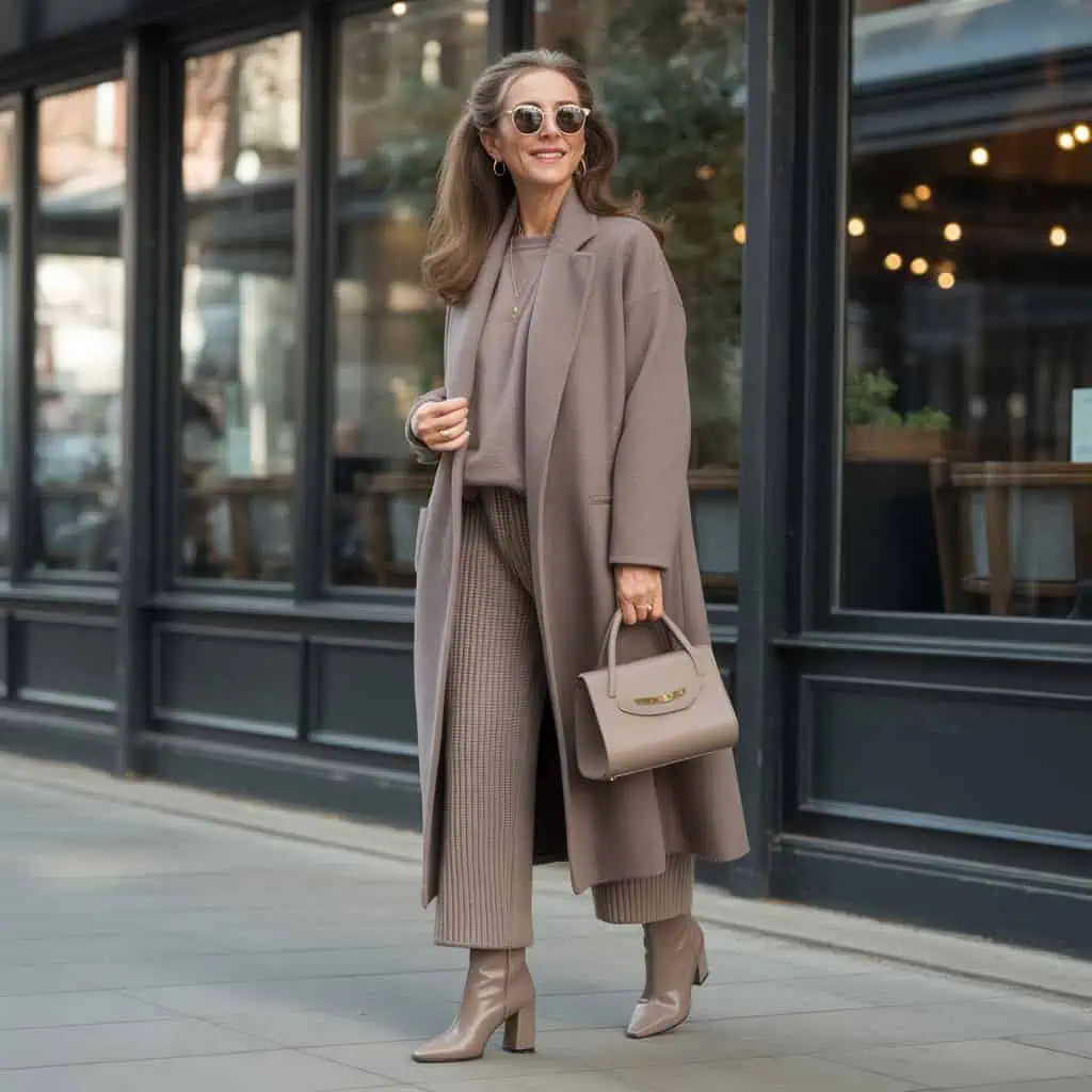 A long coat paired with a cozy knit set creates a perfect balance of sophistication and comfort, ideal for a dinner outing. The elegant silhouette of the coat adds refinement, while the knit set provides a relaxed yet stylish vibe. Choosing warm, pastel tones not only delivers a soft aesthetic but also creates an inviting appearance. Accessories like taupe sunglasses and simple gold jewelry enhance the outfit without overwhelming it. A structured handbag maintains a polished look, allowing for both function and style. This combination guarantees warmth while looking effortlessly chic, keeping you comfortable during an evening out.