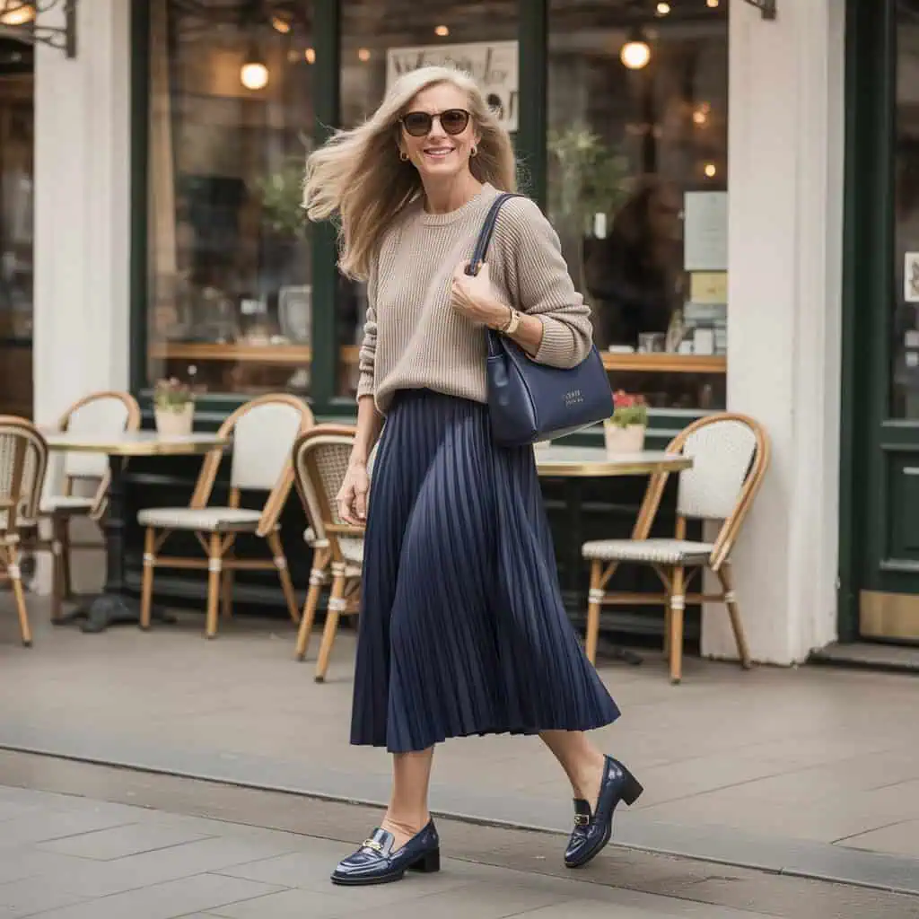 Opting for a chunky sweater tucked into a pleated midi skirt effortlessly combines warmth with sophistication, making it an excellent choice for dinner. The sweater’s relaxed fit contrasts beautifully with the structured fall of the skirt, creating an engaging silhouette. Choosing a deep navy palette brings a touch of elegance without veering into the overly formal territory. Heeled loafers add just the right amount of lift while remaining comfortable and chic. Accessories like a coordinated shoulder bag and tiny gold studs impart just enough sparkle without competing with the overall look, ensuring you feel stylish and at ease all evening.
