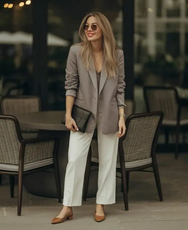 Blazers are the ultimate wardrobe power players, effortlessly elevating any outfit into chic territory. Pairing a navy blazer with a cream silk top strikes a stunning balance between refined and relaxed. The structured silhouette of the blazer adds an element of sophistication that complements the soft, flowing nature of the silk. Tailored black trousers ground the ensemble while providing a sleek foundation, making it perfect for an evening out. Accessories like oversized sunglasses and gold hoop earrings bring a dash of personality, while a structured handbag keeps the look polished. Whether you’re heading to a chic urban café or a cozy restaurant, this look showcases confidence and style.