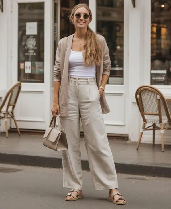 Embracing the cozy-chic aesthetic, a cardigan over a satin cami strikes the perfect balance between comfort and elegance. The softness of the cardigan provides warmth and an inviting feel, making it ideal for a relaxed dining experience, while the satin cami introduces a hint of luxury and femininity. Tailored black trousers ground the outfit, ensuring a polished look that’s still very wear-friendly. The beige heeled loafers not only complement the color palette but also offer an air of sophistication with their low profile. Brown oversized sunglasses add a playful yet stylish touch, while gold earrings provide just the right amount of shine. This outfit flows seamlessly from day to night, making it an excellent choice for those who wish to look effortlessly put together while enjoying a lovely dinner.