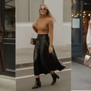 A fitted turtleneck combined with an A-line skirt is a match made in style heaven for every body shape. The sleekness of the turtleneck hugs the torso nicely, providing structure and balance, while the A-line skirt flares out gently from the waist, creating a flattering silhouette that accentuates curves in all the right places. The combination draws the eye to the waist and elegantly flows over the hips, making it a fantastic choice for those looking to feel comfortable yet chic. Pairing it with ankle boots adds a dash of modern sophistication, while a structured handbag and minimal accessories keep it polished without overwhelming the outfit. Whether you’re heading to brunch or out for an afternoon stroll, this look radiates effortless style.