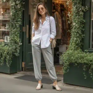 Silk button-downs are the epitome of chic versatility, effortlessly transitioning from casual to polished. The soft sheen of the fabric elevates the look, making it the perfect companion for high-waisted light-wash denim. That sleek tuck highlights your waist, creating an elegant silhouette that’s both flattering and refined. Pairing it with block-heeled pumps adds just the right amount of sophistication without sacrificing comfort—ideal for those long days of running errands or sipping coffee with friends. The oversized sunglasses and structured bag round off the ensemble, striking a balance between classy and laid-back.