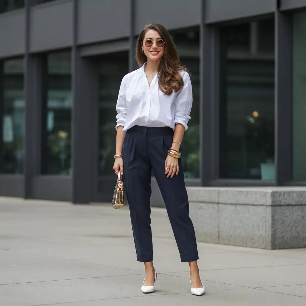 A crisp white popover is the epitome of timeless elegance, effortlessly transitioning between casual and sophisticated. The clean lines and structured silhouette provide a refreshing contrast to denim, making it an excellent choice for a polished look. Pairing this blouse with tailored navy trousers introduces a chic sense of structure to the ensemble, ensuring it remains refined. Adding accessories like oversized sunglasses and gold bangles can elevate the outfit further, providing the perfect finishing touches that whisper sophistication without overshadowing the clean vibe of the top. This look embodies modern versatility, perfect for both office settings and social gatherings.