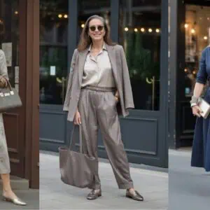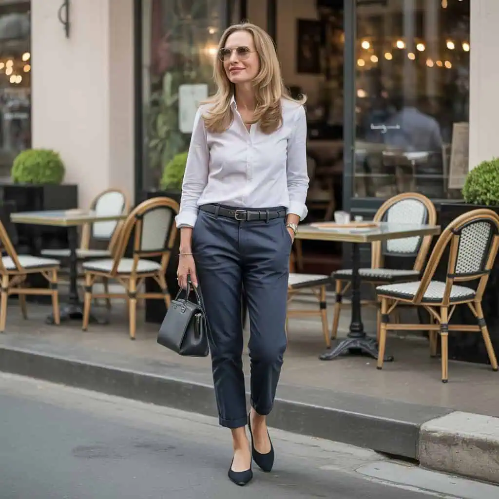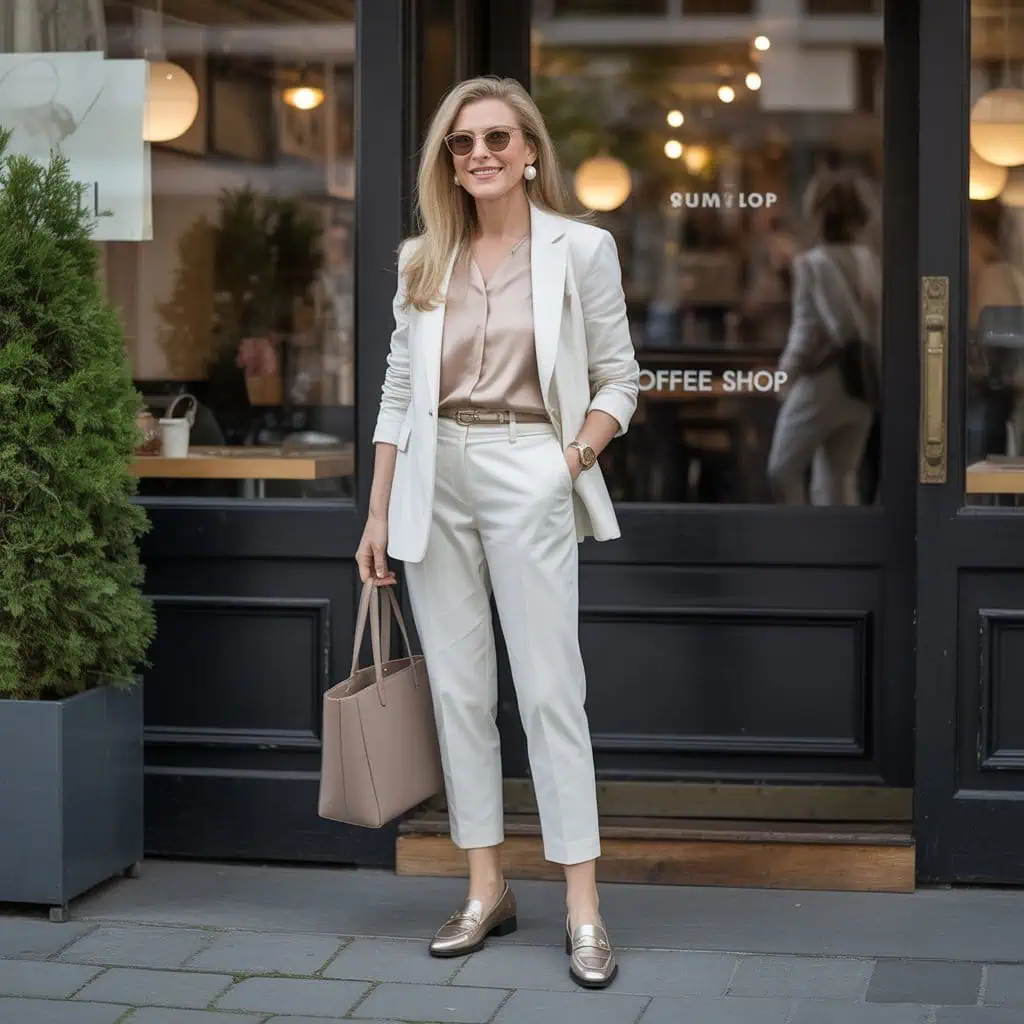 Tailored ankle-length pants paired with loafers project sophistication without compromising comfort. This polished look is effortlessly completed with a fitted blazer that brings an element of structure, creating a flattering silhouette. Keeping the blouse tucked-in not only enhances the overall formality but also reveals the waist, creating an elegant hourglass shape. The medium-sized tote bag is practical for errands while adding a stylish touch. Cat-eye sunglasses and pearl earrings add a hint of glamour—perfect for those who want to feel chic while still enjoying a day out. It’s about looking sharp while radiating confidence!