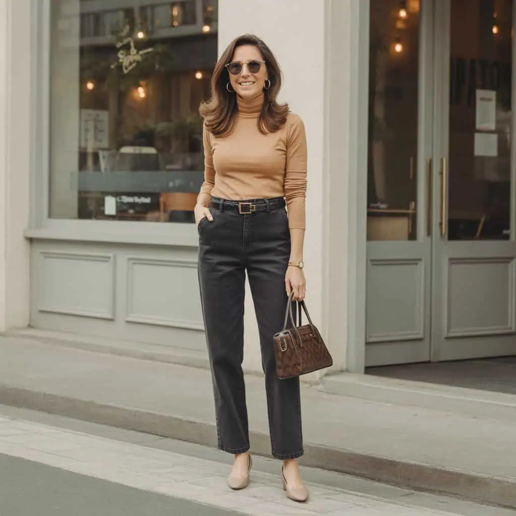 Opting for dark denim paired with a fitted turtleneck strikes the perfect balance between casual and refined. The deep hue of the jeans offers versatility, while the slim silhouette of the turtleneck accentuates your figure, creating an elongated look. Ballet flats are both comfortable and elevate the outfit without sacrificing ease of wear, making this combination ideal for a busy day. A structured handbag adds professionalism, while minimal hoop earrings keep the vibe modern and fresh. This outfit’s coordinating elements allow you to move through errands stylishly, proving that classic pieces can deliver a contemporary flair.