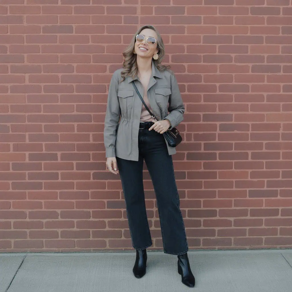 A utility jacket is the perfect blend of practicality and style, making it an exceptional choice for errand days. The fitted light gray option here adds a subtle elegance, while its structured silhouette creates a flattering shape when layered over a tucked-in top. Pairing this jacket with straight-leg black jeans keeps the look sharp and chic. The low kitten-heel ankle boots not only ensure comfort but also elevate the outfit, adding just the right amount of sophistication. Accessorizing with a crossbody bag and square sunglasses adds a trendy touch, making this ensemble effortlessly stylish yet functional for whatever the day throws at you.