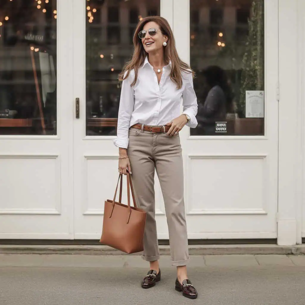 Chinos paired with a crisp button-down shirt create a refined look that’s both polished and practical, perfect for days when you want to feel put together. The versatility of chinos allows you to choose various colors and patterns, while a classic white shirt adds freshness to the ensemble. Tucking in the shirt gives you a tailored appearance, emphasizing your waist and creating a streamlined profile. Classic ballet flats keep this outfit grounded and comfortable, making them the perfect footwear choice for an errand-filled day. Accessorizing with a structured handbag and aviator sunglasses injects a modern vibe into the look, allowing you to stay stylish while effortlessly handling your to-do list. This outfit seamlessly merges classic elements with a relaxed attitude, making it a go-to choice for any occasion.