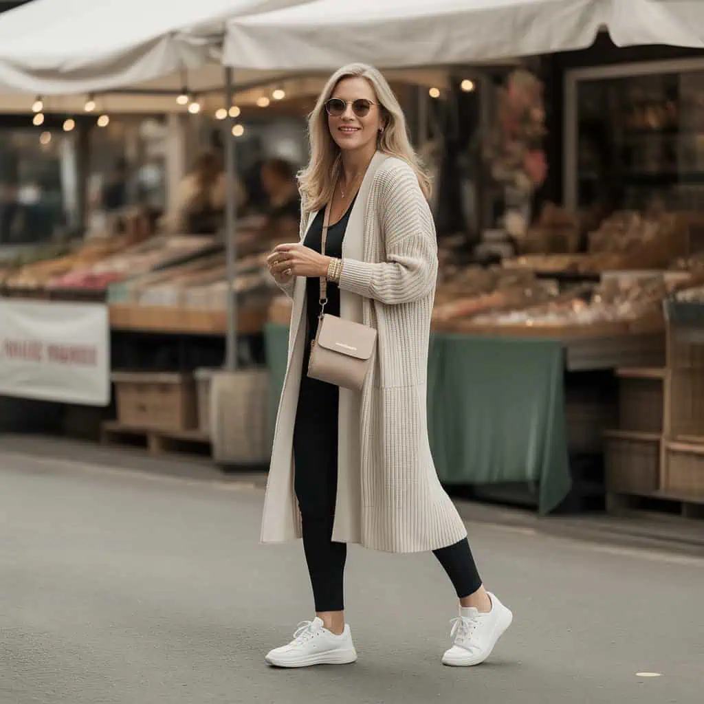 Opting for leggings paired with a longline knit cardigan strikes the perfect balance between comfort and style, especially after 50. The longline silhouette offers a flattering shape that elongates your figure, while leggings provide a stretchy, forgiving fit that allows for ease of movement when you’re out running errands. Choosing sleek sneakers keeps the look chic and sporty, allowing you to navigate through your busy day without sacrificing an ounce of style. Layering with a light-knit creates visual interest—whether you opt for earthy tones or bold hues, you can easily mix and match to reflect your personal style. Plus, accessorizing with a crossbody bag and minimal jewelry adds just the right touch to elevate your outfit effortlessly.