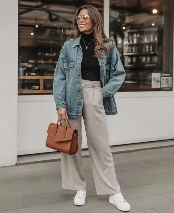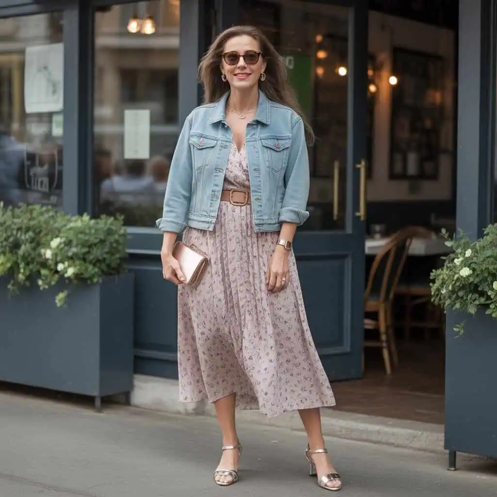 Embrace the perfect balance of relaxed chic with a midi dress layered under a denim jacket. The floral print adds a touch of femininity, while the belted waist accentuates your figure beautifully. This combination is not only stylish but incredibly comfortable for running errands, allowing ease of movement without sacrificing elegance. A light-wash jacket complements the dress’s colors, making the outfit approachable yet put-together. With kitten-heel sandals, you achieve a little lift that elongates your silhouette, while oversized sunglasses give an air of effortless sophistication—ideal for stepping confidently into your day.