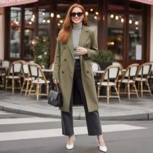 Olive green is understated yet deeply autumnal, giving any outfit a grounded, nature-inspired feel. French women incorporate it into utility jackets, tailored trousers, or soft knit sweaters. This muted green works beautifully with camel, cream, and navy, creating a sophisticated fall palette that’s both urban and rustic. For women over 60, olive is a subtle way to wear color without stepping too far outside a neutral comfort zone. It’s also flattering against silver or salt-and-pepper hair, as the earthy tone enhances rather than competes with natural coloring.