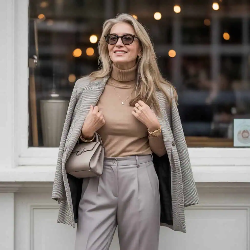 A lightweight turtleneck is the ultimate layering piece for fall, offering both warmth and versatility without bulk. In soft shades like camel or light gray, these tops can effortlessly transition from a casual outing to a more refined setting. Pairing it with tailored pants creates an elegant silhouette that flatters all body types. The beauty of a turtleneck lies in its ability to layer beautifully under jackets, cardigans, or even a scarf without feeling restrictive. This subtle sophistication is perfect for women over 60 who want to maintain their style while enjoying the cozy comforts of the season.