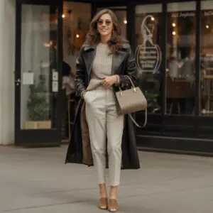 Cozying up in a cashmere or merino wool sweater is the ultimate fall luxury, especially when you opt for soft, muted tones like camel. These fabrics are not just warm; they also drape beautifully, enhancing your silhouette without clinging. When teamed with tapered dark trousers, the outfit balances comfort with elegance, making it perfect for any autumn day out. Stylish flats ensure you’re on-trend while remaining comfortable, and a minimalist handbag brings a modern touch. Add delicate jewelry for understated elegance, and you have a go-to outfit that looks effortlessly chic whether you’re enjoying brunch or a stroll through the park.
