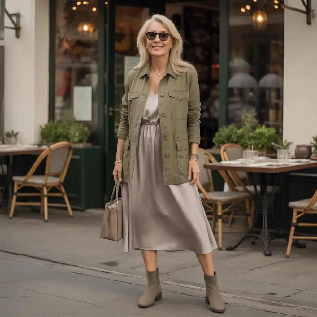 When the weather turns crisp, ankle boots become the unsung heroes of your footwear collection. They combine practicality with style, allowing you to navigate busy days without sacrificing comfort. Opt for a chic, tailored olive green jacket over a simple grey dress to create a balanced ensemble that plays with colors and textures. Ankle boots in a sleek design complement this outfit beautifully while providing the support you need. Add in stylish sunglasses and a sophisticated handbag for that extra touch of finesse. This combination ensures you’re ready for anything, from leisurely strolls to brunch dates, in effortlessly chic fashion.