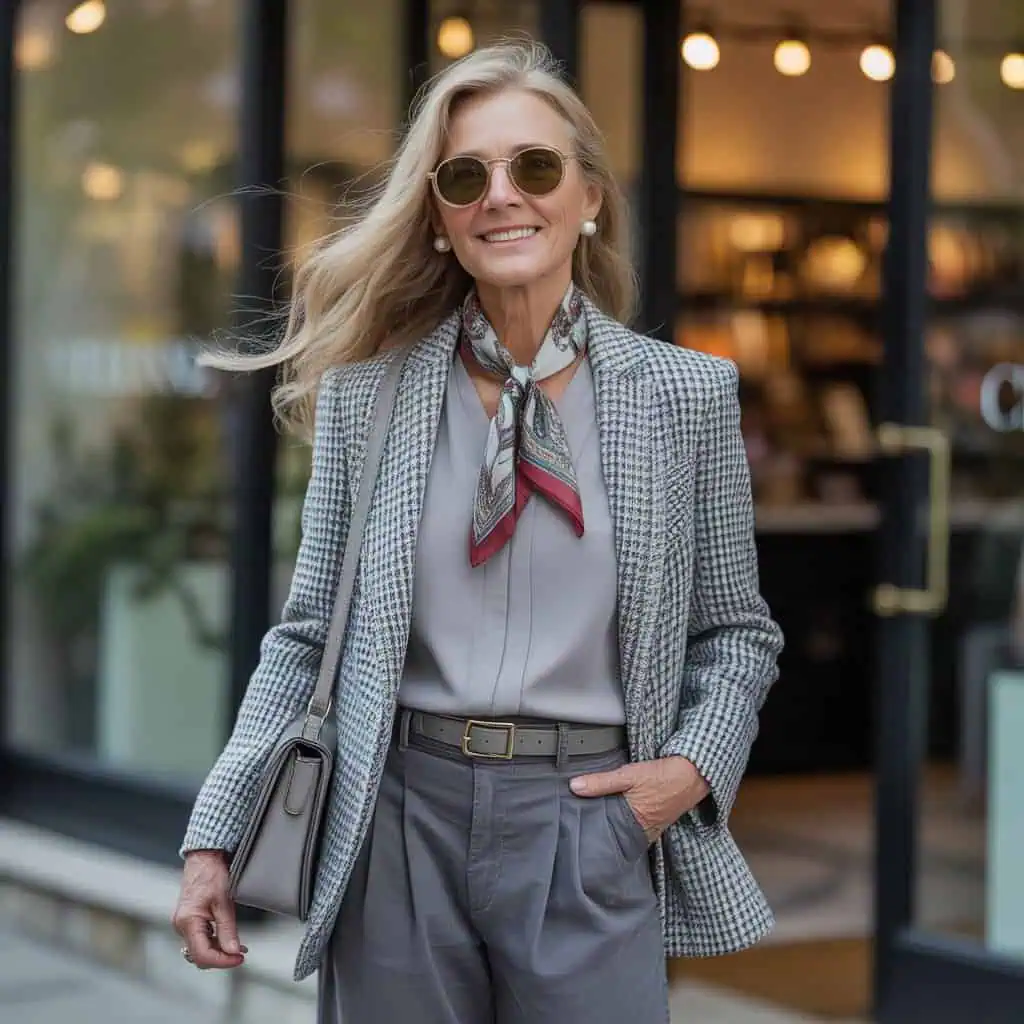 A silk scarf is a timeless accessory that holds the power to transform even the simplest outfits into something special. By introducing a patterned silk scarf tied around the neck, you can imbue your look with a splash of color and luxury that subtly elevates your ensemble. The combination of a tucked-in grey blouse with belted straight-leg denim pants and a classic grey tweed blazer creates a cohesive, refined palette that allows the scarf to take center stage. This elegant touch draws the eye and adds an air of sophistication, making the outfit feel both polished and effortlessly chic. With the addition of grey elegant loafers, a medium satchel bag, stylish sunglasses, and small pearl earrings, the overall look exudes timeless grace—showcasing how thoughtfully chosen details can make a lasting impression.