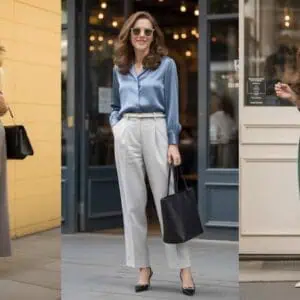 Elevating any look, a velvet blazer brings an instantly glamorous touch, perfect for holiday gatherings. Paired with cream silk, the blouse offers a luxurious contrast against the rich burgundy of the jacket. The wide-leg trousers, in neutral beige, not only elongate the leg line but also provide comfort for an evening filled with celebrations. With a structured tote and chic loafers completing the ensemble, it strikes the ideal balance between sophisticated and relaxed. Minimal jewelry allows the outfit to shine without overwhelming, ensuring you look polished and festive.