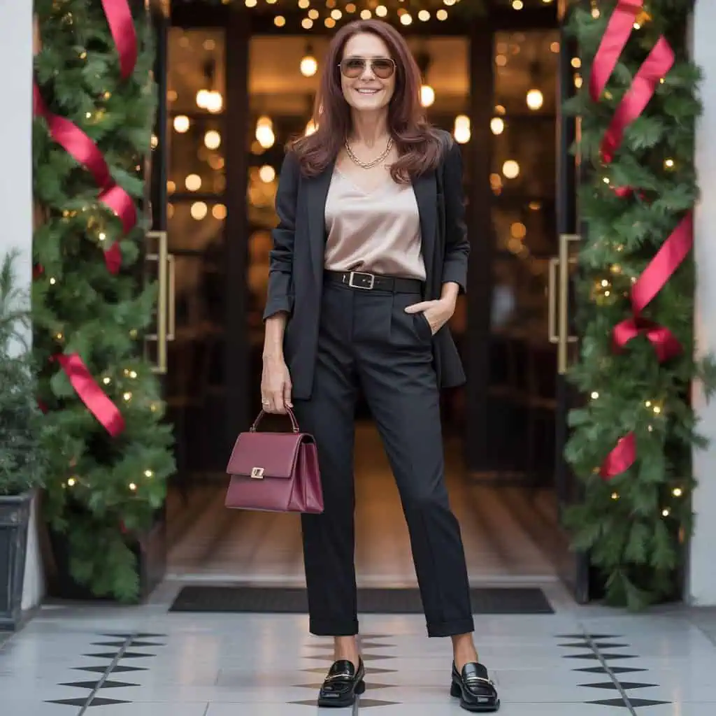A black pantsuit is a quintessential staple with immense versatility, immediately elevating any holiday occasion. Layering it over a sumptuous satin camisole introduces a luxurious element, creating a stylish juxtaposition between structured tailoring and fluid fabric. The belted trousers add structure and definition, while leather loafers provide both comfort and a smart finishing touch, ensuring you can enjoy the festivities without worry. This ensemble is a sophisticated nod to timeless elegance, portraying confidence and poise, allowing anyone over 60 to embrace their unique style while resonating with modern trends.