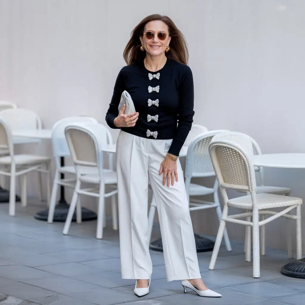 An embellished cardigan is a wonderful way to add personality without overwhelming your look. Opting for a black hue keeps it looking good and fresh while the embellishments bring a touch of festive glamour, perfect for holiday gatherings. Pairing it with straight-leg pants elongates the silhouette and offers a timeless balance that flatters all body types. The white heels not only provide comfort but also add a subtle sophistication. Accessorizing with gold earrings ensures that the outfit feels modern rather than fussy, embodying a chic, effortless style perfect for the season’s festivities.