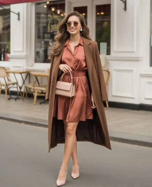 Adding a silk scarf to your autumn ensemble is like giving it a warm hug! Not only do these scarves infuse a pop of color and pattern, they also provide an elegant touch that effortlessly elevates any outfit. The way the scarf drapes loosely around the neck creates a relaxed vibe while keeping you chic and stylish. This simple accessory can transform the most basic look into a statement ensemble. Pairing it with a wrap dress, like taupe, balances the softness of the fabric and flair of the dress. The combination of colors and textures plays beautifully, ensuring you look as chic as you feel without trying too hard.