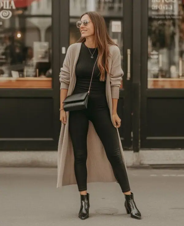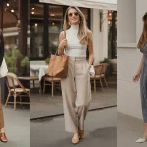 Wide-leg trousers are not just a trend—they’re a staple for any wardrobe, especially when you want comfort and style at once. These trousers offer a flattering silhouette that skims over the body, giving a polished look without sacrificing comfort. The pairing with a fitted top creates a nice balance, drawing attention to the waist while allowing for movement. Opting for neutral shades, like cream for the trousers and black for the top, provides versatility and sophistication. This look is perfect for casual outings or more refined gatherings where you want to exude effortless elegance—plus, who doesn’t love a stylish pair of flats for ease?