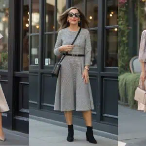 A grey blazer paired with tailored black jeans is a timeless combo that exudes confidence and sophistication. This chic look strikes the perfect balance between polished and casual, making it suitable for various occasions. The structured blazer elevates the outfit, adding refinement and complementing the body’s natural shape. Black jeans create a sleek silhouette while providing versatility—ideal for day-to-night transitions. Accessorizing with pointed heels and minimal jewelry adds an elegant touch, while a leather tote introduces practicality without sacrificing style. This ensemble empowers women to express their individuality while emphasizing their timeless charm.