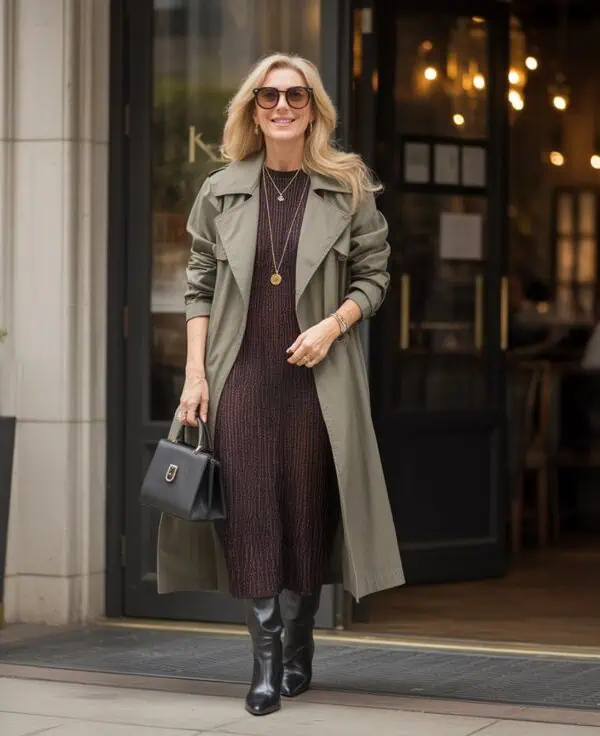 The trench coat is a classic design with a modern twist, especially when paired with casual blue denim. This combination radiates effortless elegance, making it the perfect winter outfit for the discerning woman over 60. The key lies in the cinched waist of the trench, which enhances the figure while offering a layered look that provides warmth without bulkiness. Casual blue jeans introduce a laid-back vibe, ideal for everyday errands or coffee outings. Tan block heels elongate the legs while ensuring comfort, while chic accessories like gold hoops and a crossbody bag pull the look together, making it both stylish and functional.