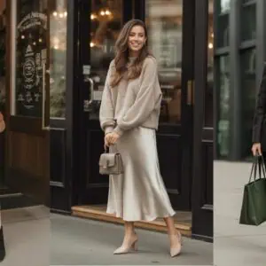This ensemble effortlessly marries comfort with urban chic. The bomber jacket brings a sporty vibe, perfectly complementing the relaxed fit of the cargo pants. Deep forest green adds a rich touch, while the cream top serves as a subtle contrast that lightens the look. Paired with white sneakers, the outfit remains fresh and casual, ideal for those laid-back autumn days. Accessories, like the crossbody bag and chic round sunglasses, enhance the overall aesthetic without overwhelming it. This combo screams confidence and readiness for any autumn outing, whether it’s a casual gathering or a coffee run.