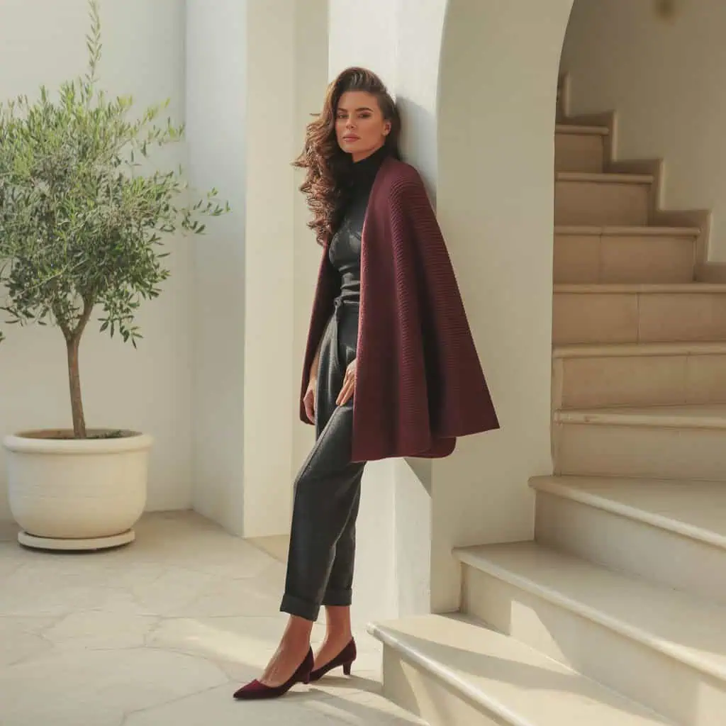 Transform any ensemble with a structured knit cape or poncho that exudes confidence and style. These dynamic layering pieces drape beautifully around the shoulders, adding a sophisticated silhouette while keeping you warm. Choose a rich burgundy or deep forest green to make a statement, or keep it neutral with shades of grey or camel. Perfect for both casual and smart occasions, wear it over a fitted bodysuit and skinny jeans for a sleek look, or over a flowy dress paired with burgundy heels for an artful ensemble worthy of any gallery opening.