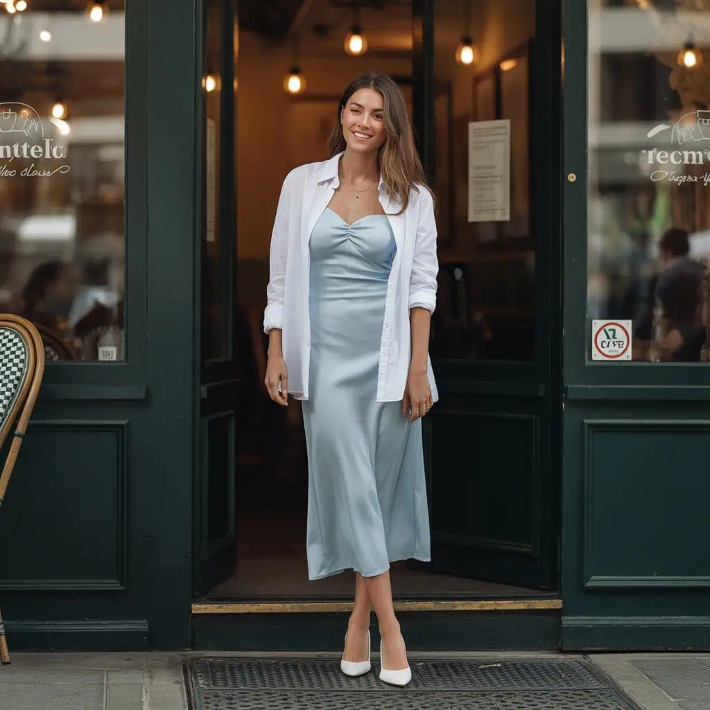 An essential for any wardrobe, the crisp button-up shirt is timelessly chic and endlessly adaptable. Choose a classic white or experiment with soft pastels for seasonal flair; the crisp collar and structured fit effortlessly elevate any ensemble. Perfect for layering, it can be tucked into tailored trousers for a polished look or left loose over a fitted slip dress for a more relaxed approach. A pop of color through accessories, like a bold belt or statement earrings, adds a modern twist to this wardrobe staple. Embrace playful layering with a vest or lightweight sweater thrown over your shoulders.