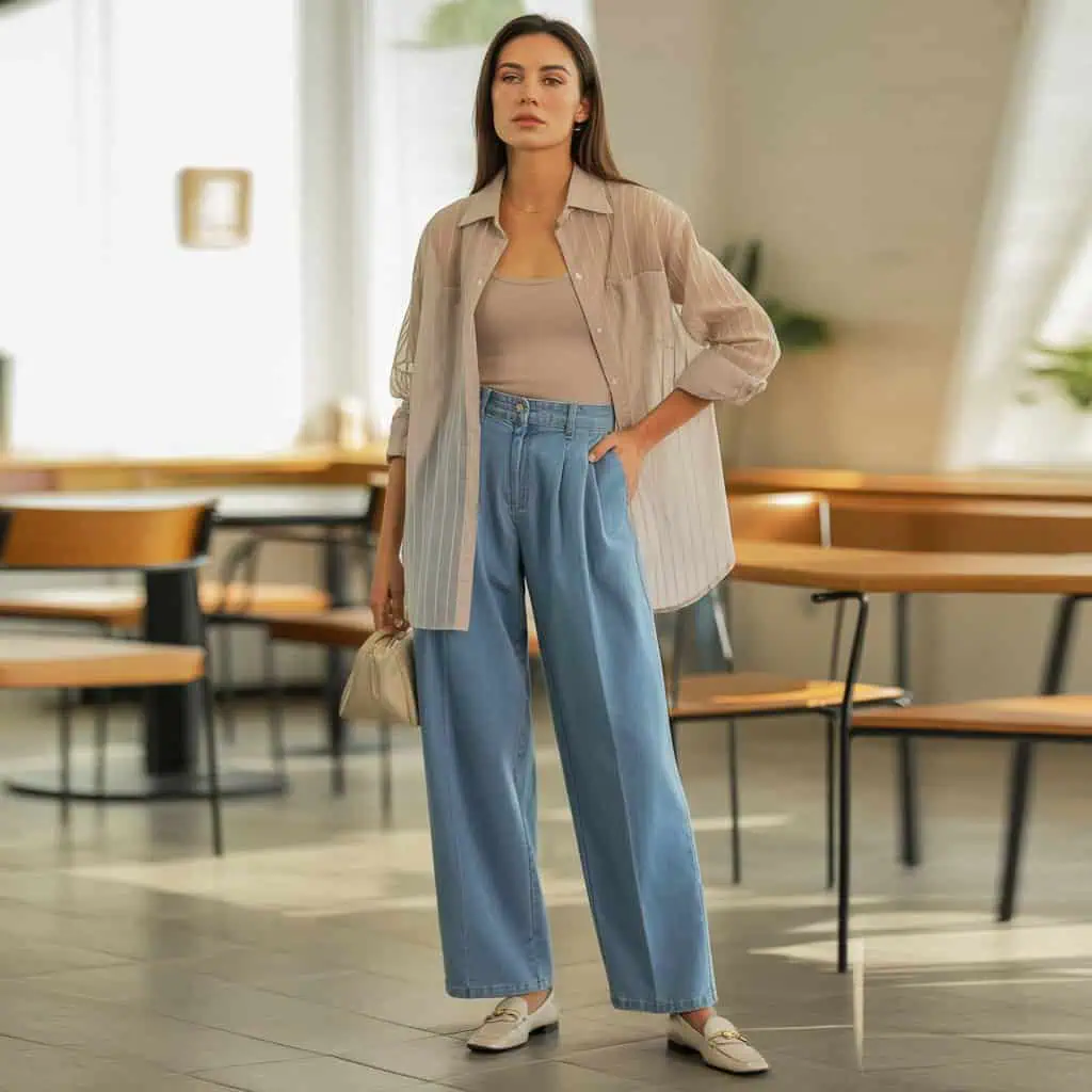 Layer a sheer button-down shirt over a fitted camisole or lightweight turtleneck to create a chic, breathable look that works for any season. Pair it with tailored trousers or high-waisted wide-leg jeans for a balanced silhouette that feels both modern and timeless. Add minimalist accessories and sleek loafers or classic flats to complete the ensemble, perfect for everything from casual office days to weekend brunches. This layering piece elevates your outfit with subtle texture and effortless elegance, making it an age-proof staple you’ll reach for again and again.