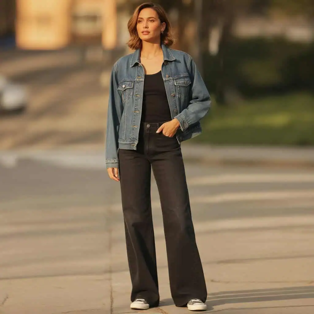 A classic denim jacket paired with straight-leg or wide-leg jeans is a timeless duo that brings both structure and laid-back cool to any outfit. Layered over a black tank top, the jacket adds a rugged yet polished edge, perfect for transitional weather or breezy summer evenings. This combination embraces the versatility of denim while maintaining an effortlessly chic vibe. Finished with sneakers and minimal accessories, the look is balanced and sophisticated—ideal for casual outings, city strolls, or relaxed social gatherings.